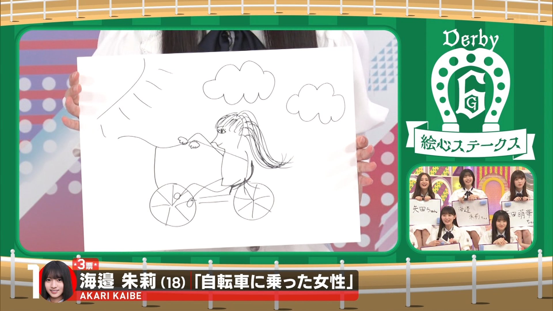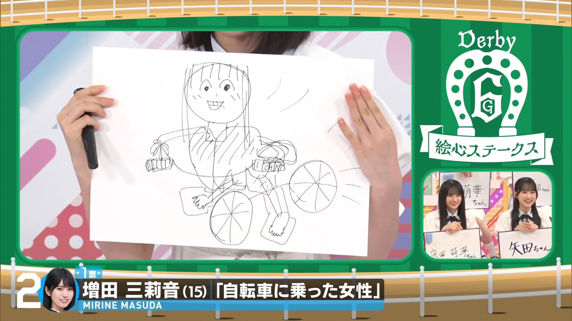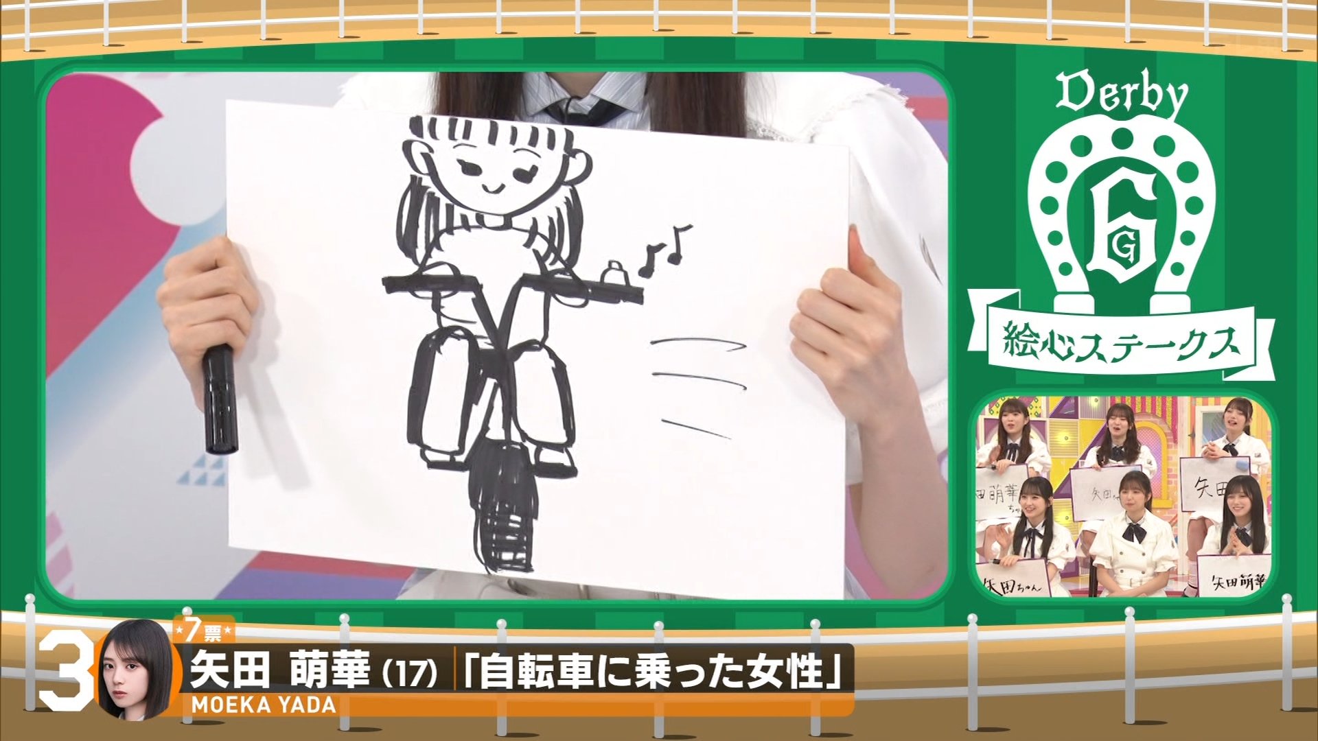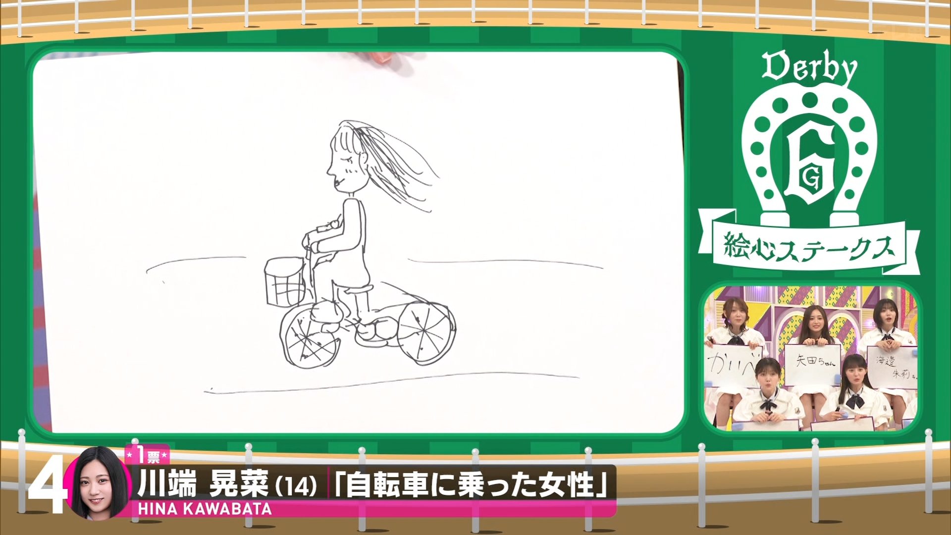 結果: メンバーの絵は「怖い」「気持ち悪い」「裸」「ハンドルが変」などと評されました。最終的に、川端さんの絵が池田先生の判定で一番上手とされ、川端さんがこのレースで1ポイントを獲得しました。