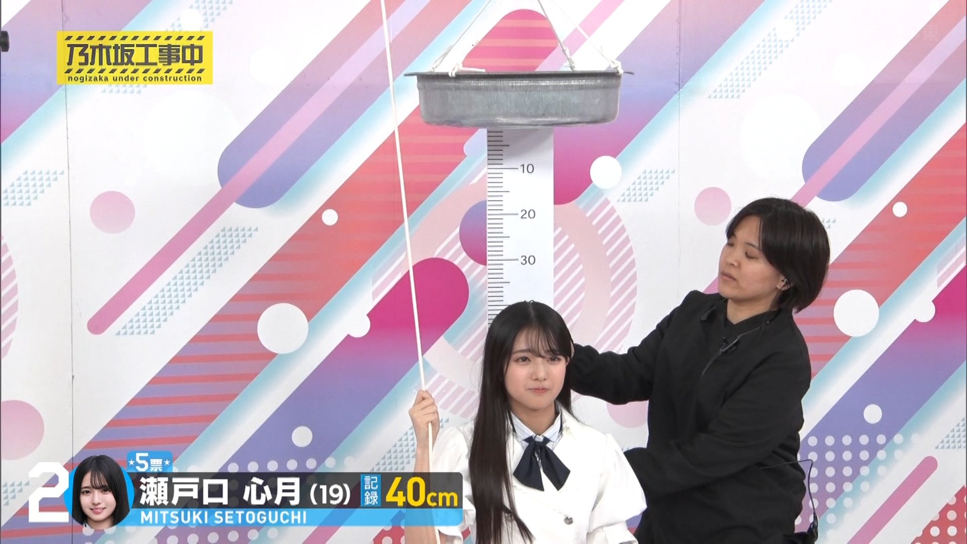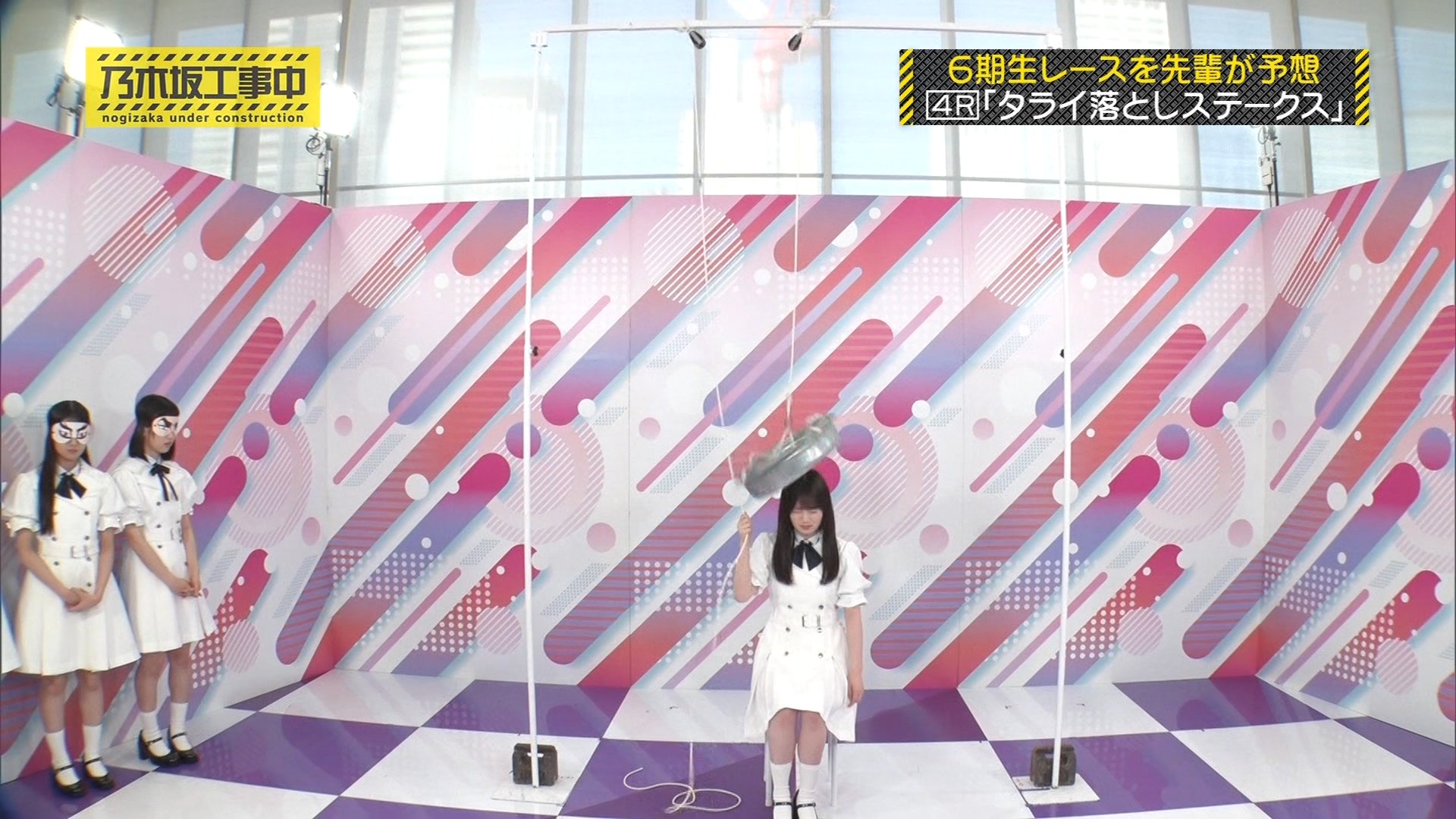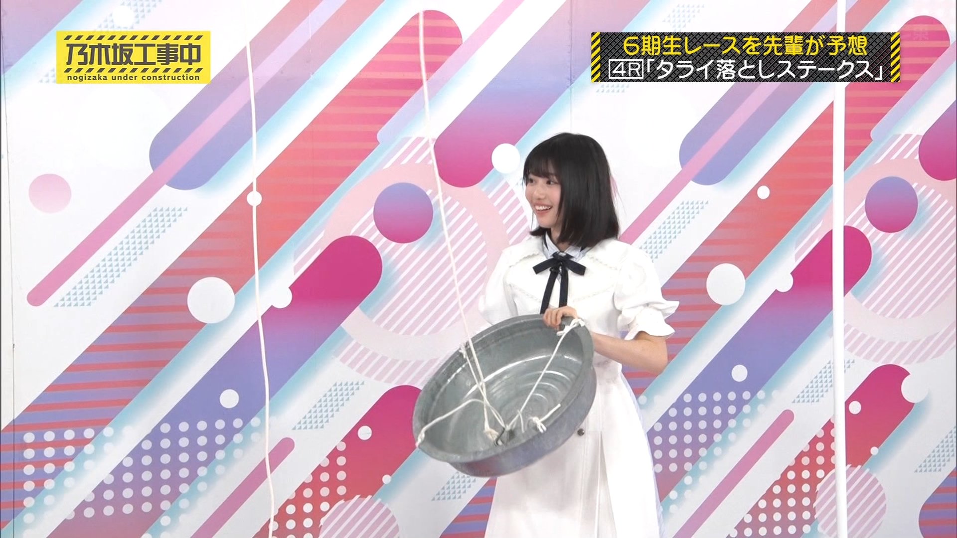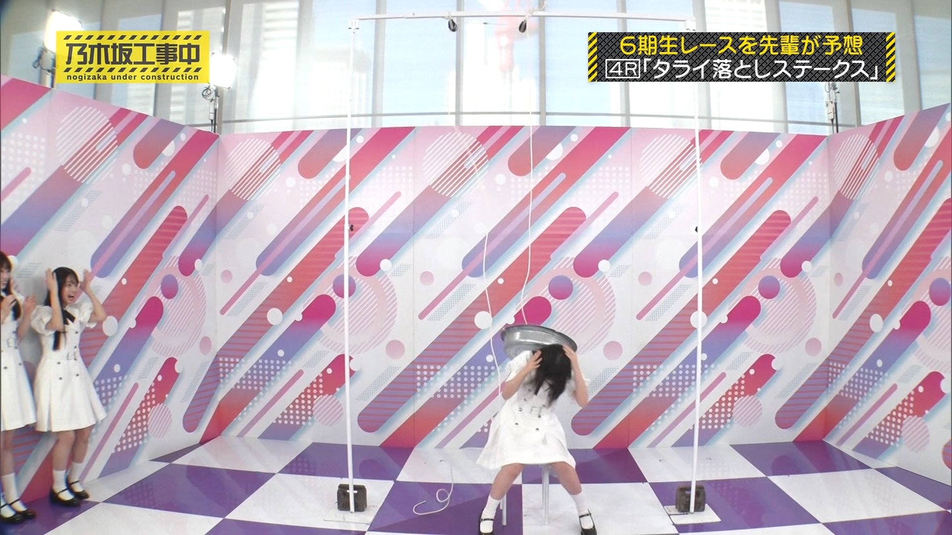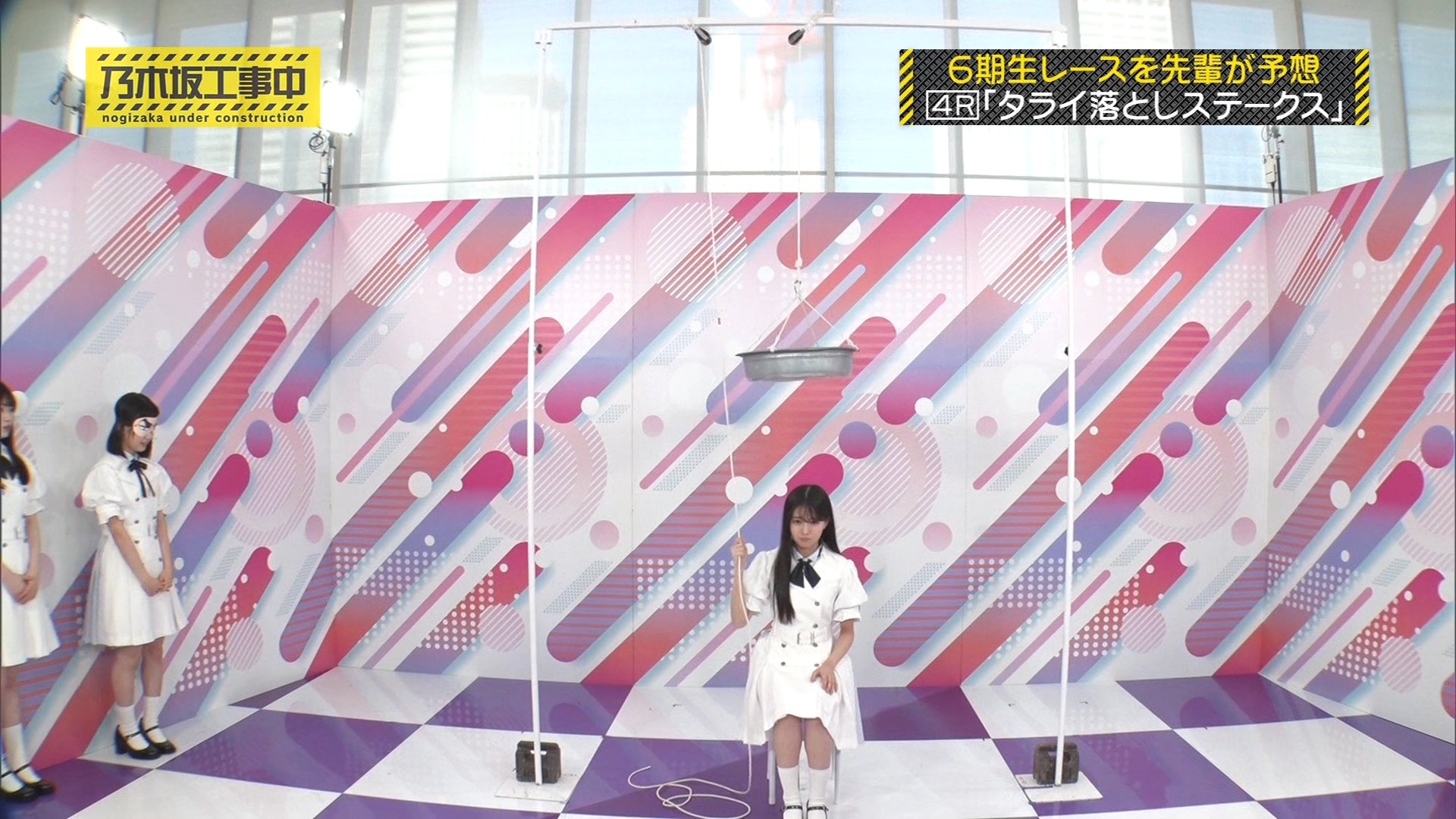 内容: 6期生が一人ずつ、頭上から落ちてくるたらいにどれだけギリギリまで近づけるか挑戦する競技です。頭にぶつかるとアウトとされました。