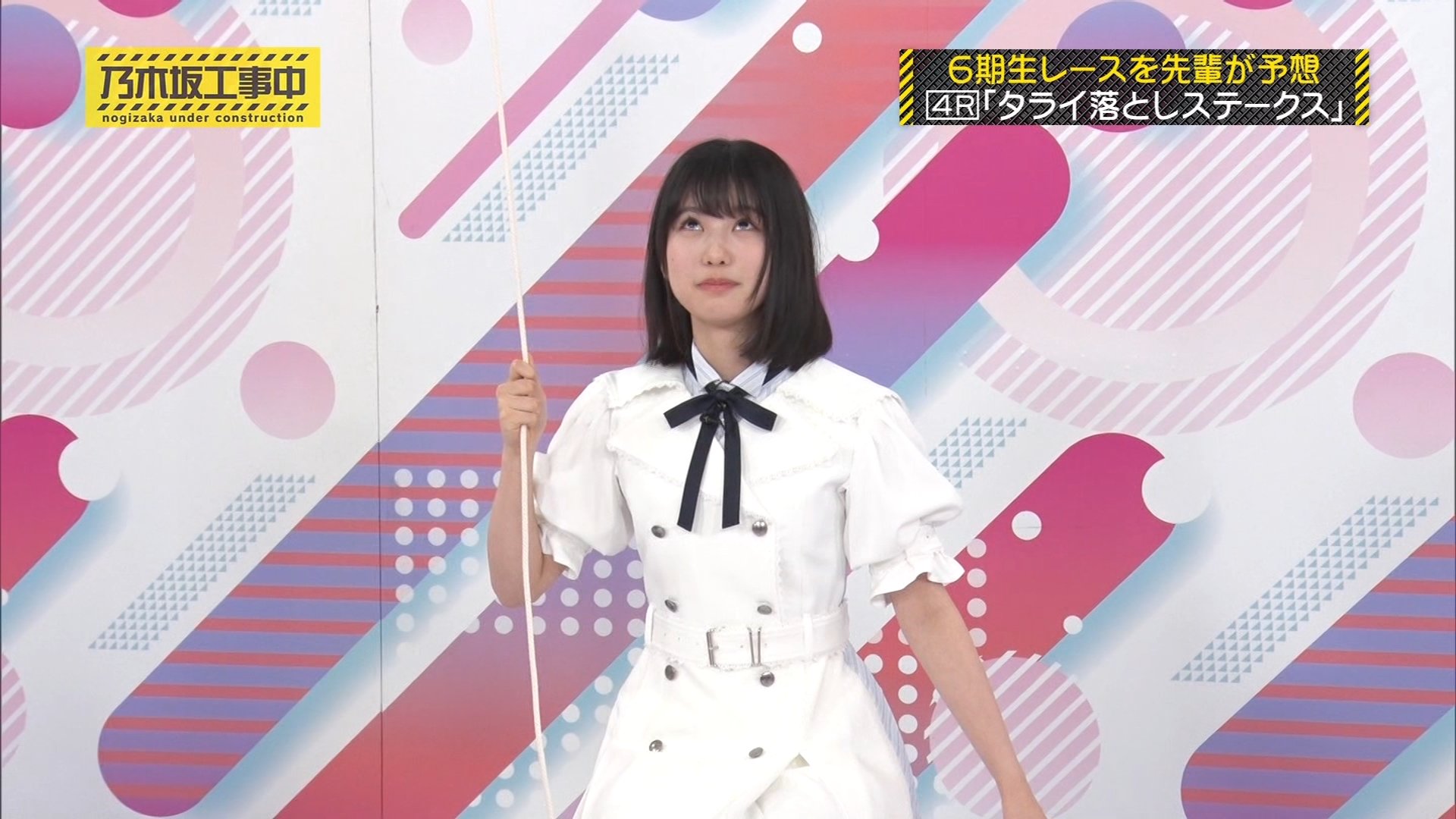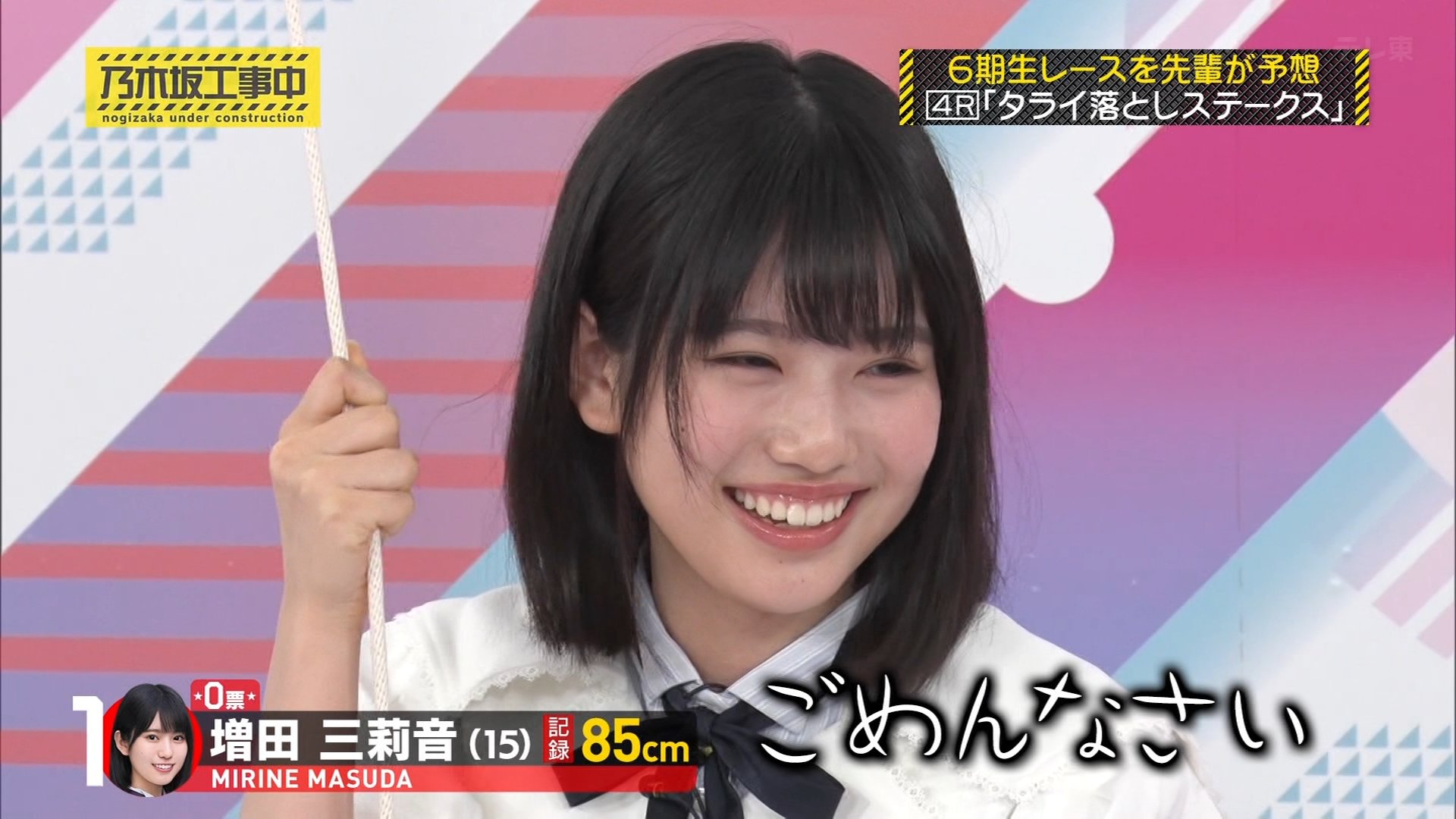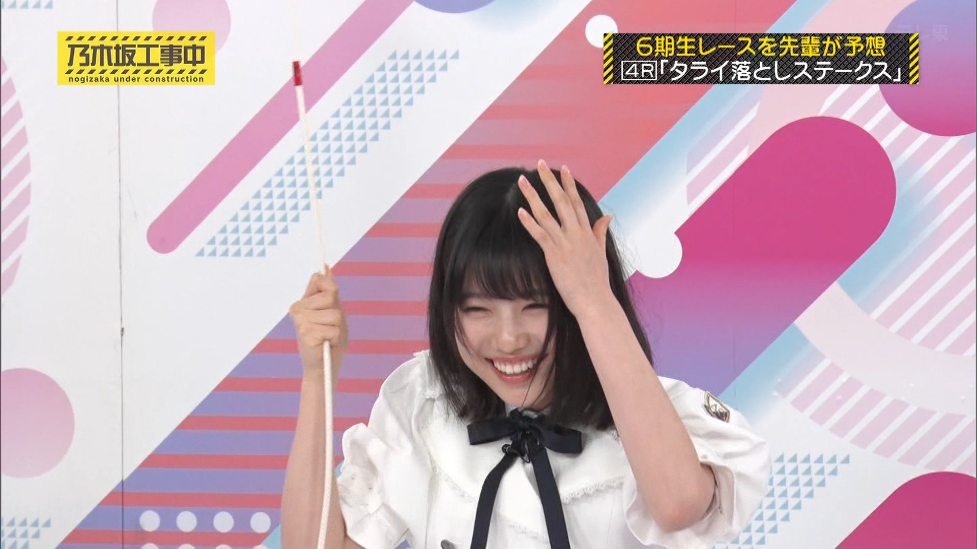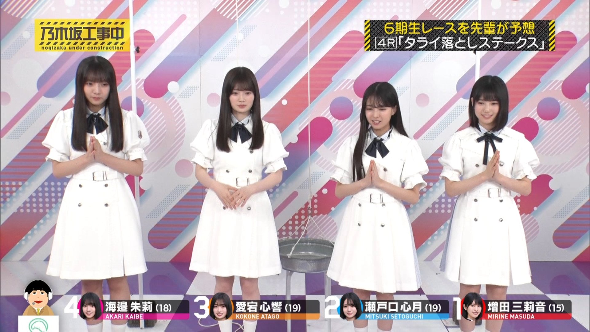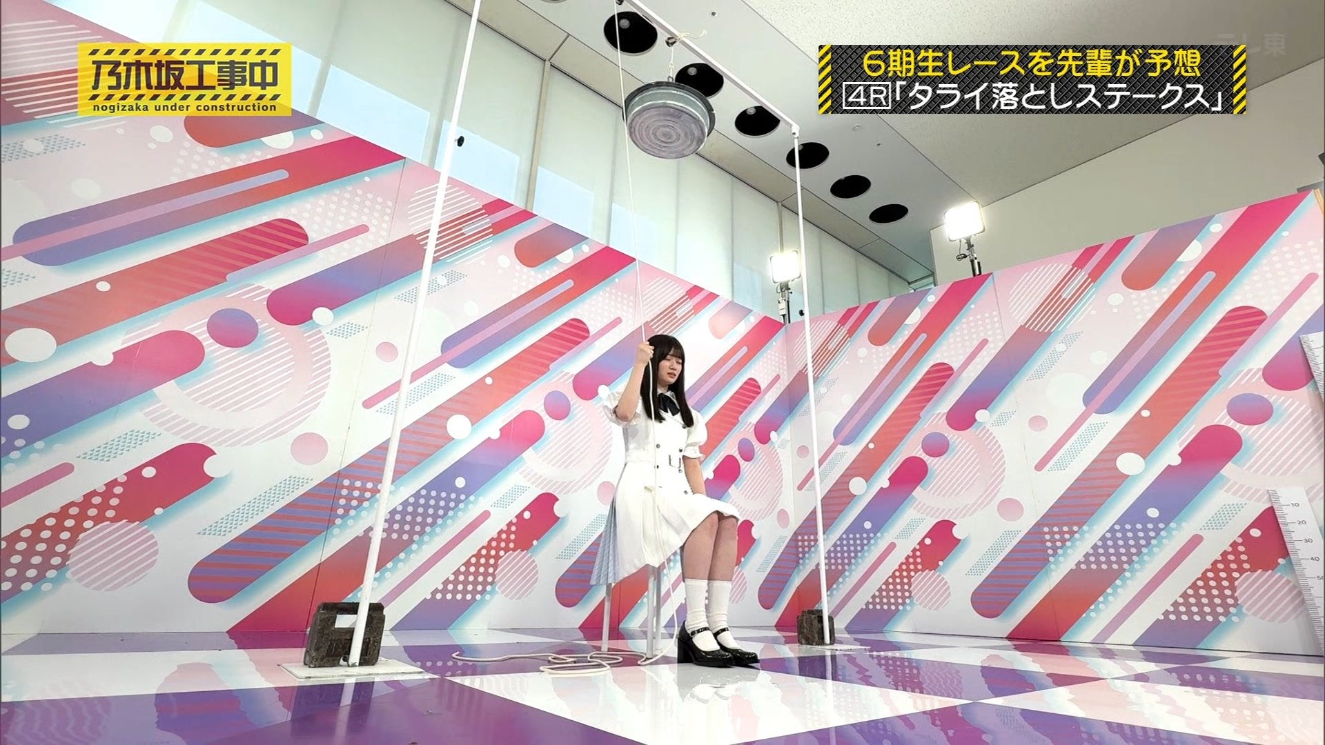 内容: 6期生が一人ずつ、頭上から落ちてくるたらいにどれだけギリギリまで近づけるか挑戦する競技です。頭にぶつかるとアウトとされました。
